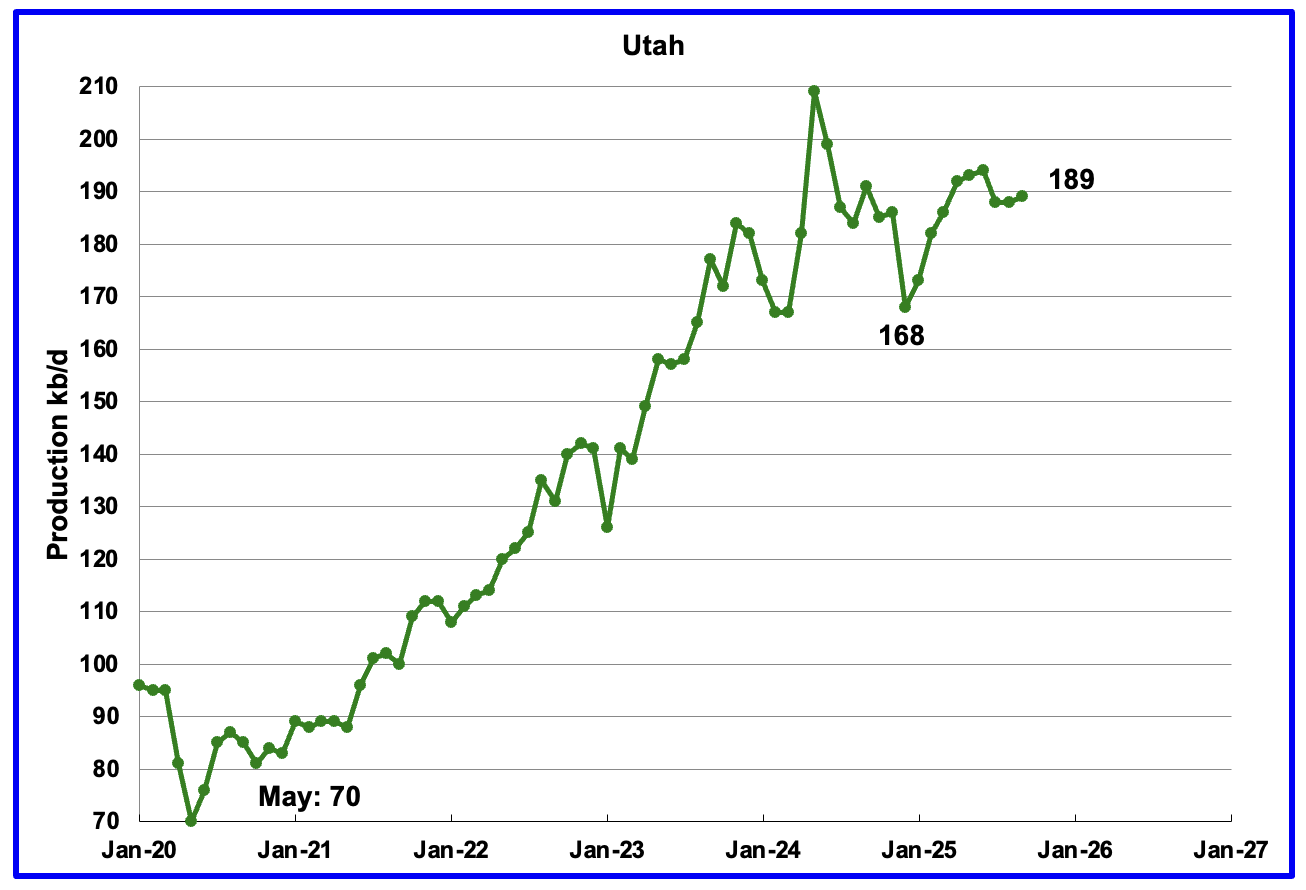 September’s production rose by 1 kb/d to 189 kb/d. Utah had 8 rigs operating from October 2024 through May 2025 but dropped to 6 in early June but returned to 9 in October and November.