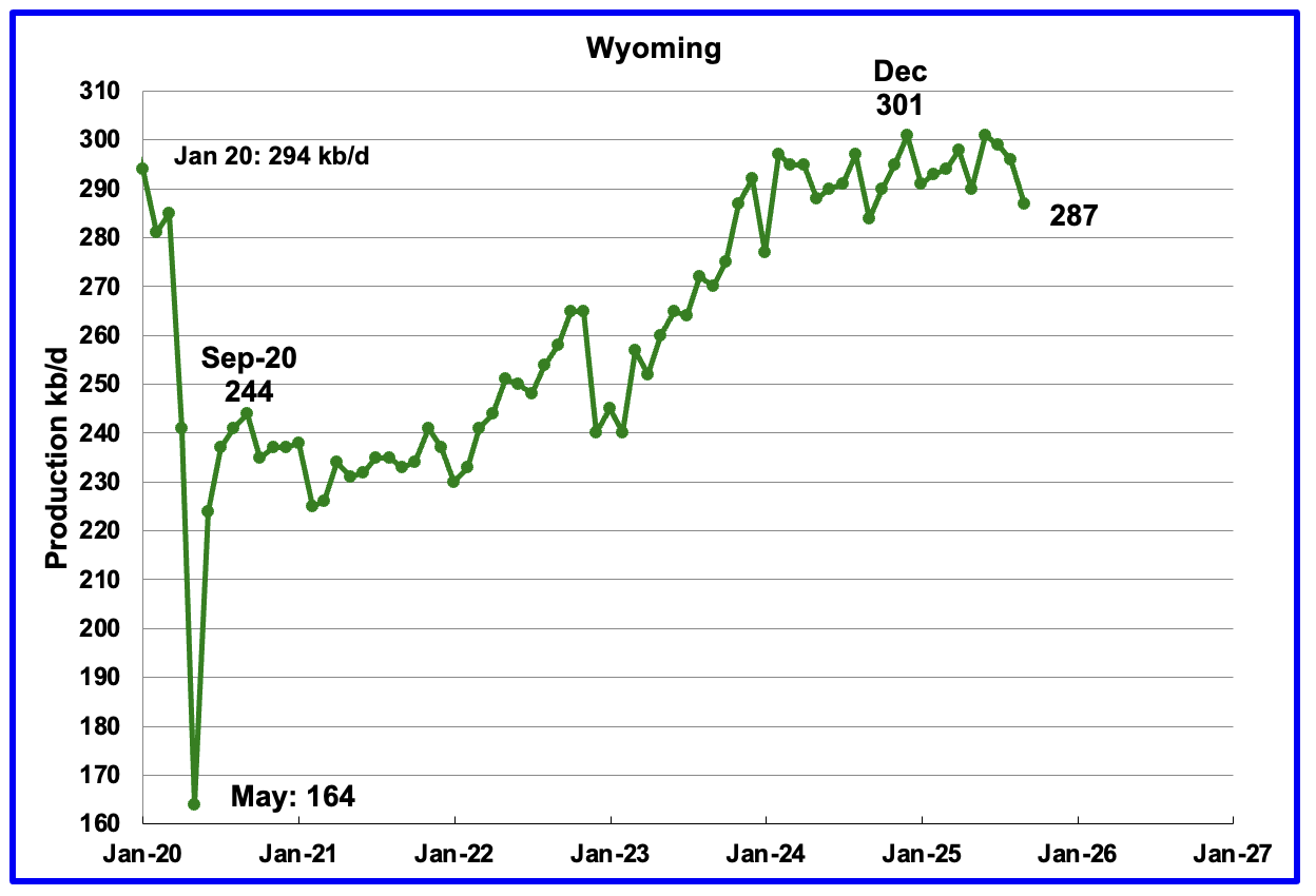 Wyoming’s oil production reached a post pandemic high in December 2024 and appears to have entered a plateau phase around 295 kb/d. September’s production dropped by 9 kb/d to 287 kb/d.