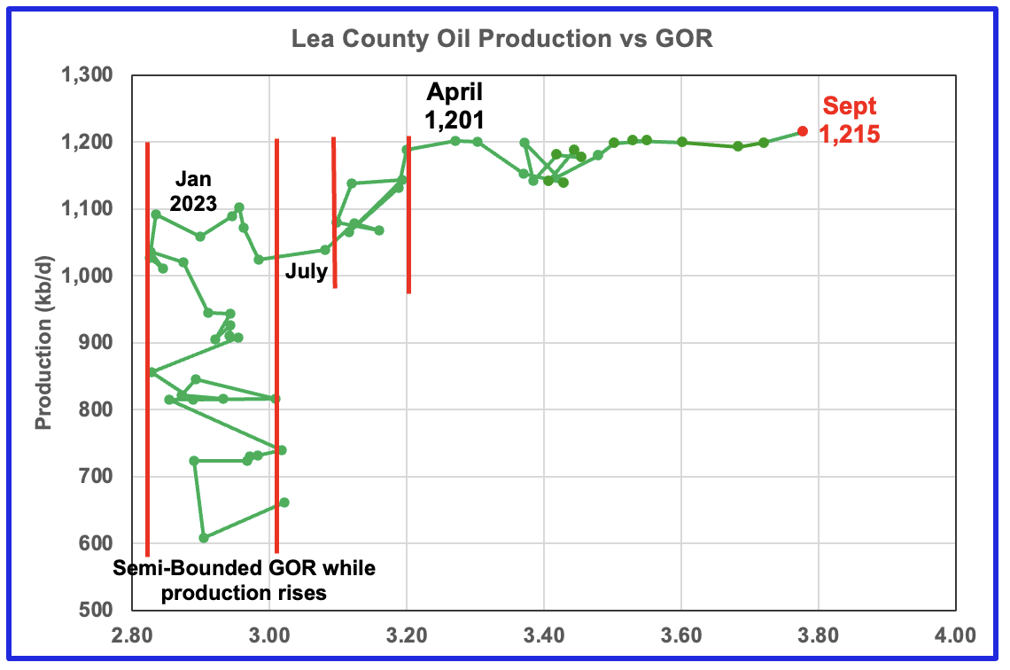 This zigging and zagging GOR pattern within a semi-bounded GOR while oil production increases to some stable level and then moves out to a higher GOR to the right has shown up in a number of counties. See a few additional cases below. The rising GOR to new highs in Lea county is an early indicator that production may be close to entering a declining phase even though the September projection does not confirm this.