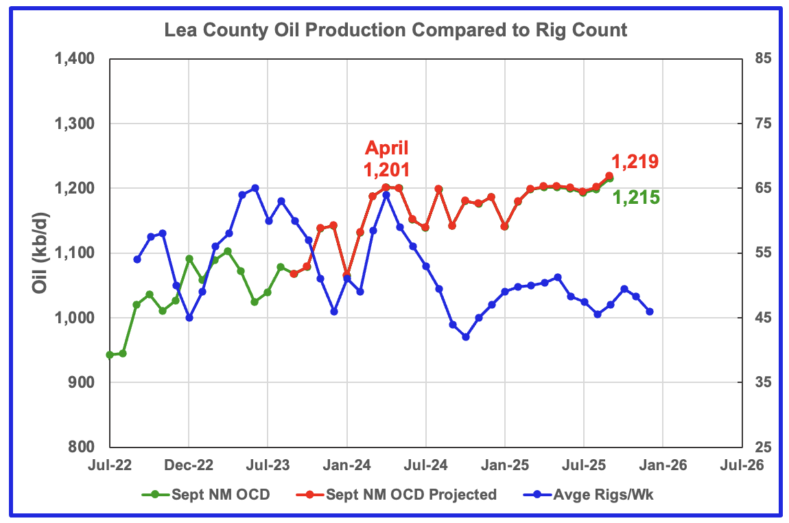 Preliminary September data from New Mexico’s Oil Conservation Division (OCD) indicates Lea County’s oil production rose 17 kb/d to 1,215 kb/d, green graph, and is a second indictor that production is rising in Lea County. The September production rise could be associated with the rising rig count that starts in time shifted September 2025.