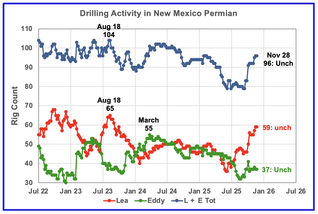 The current rig counts in Lea and Eddy counties are moving in different ways, Lea is adding while Eddy is holding steady. Over the past month Lea added 4 rigs to 59 while Eddy has held steady at 37.