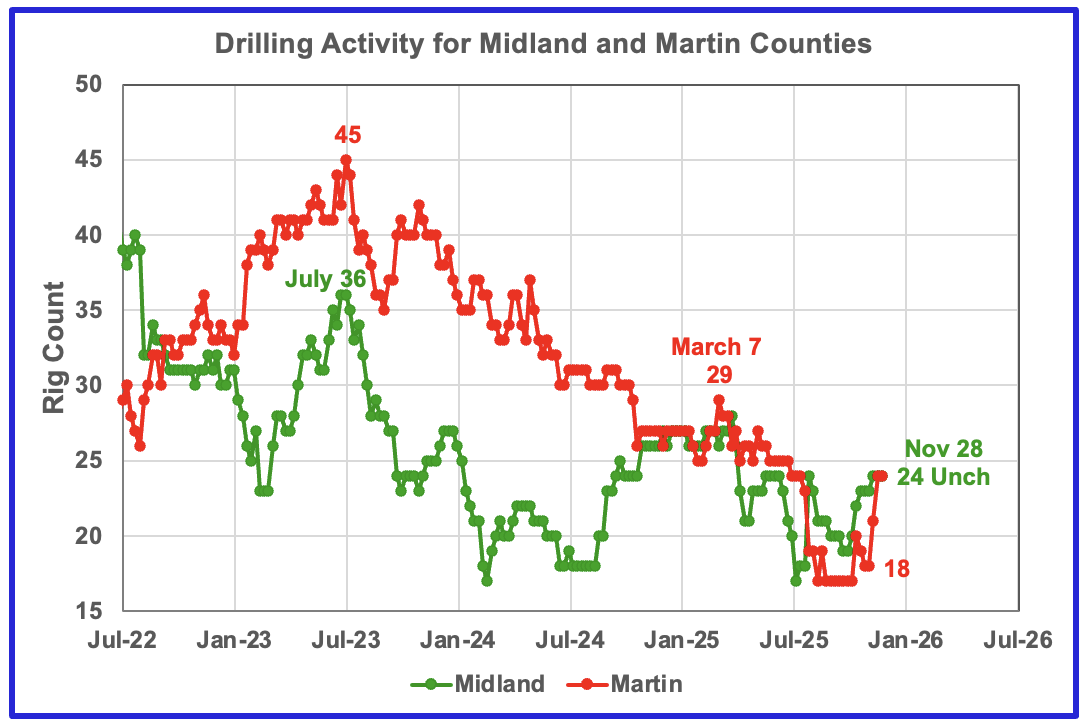 The rig count in both Midland and Martin counties have increased over the past month. Midland added 1 rig while Martin added 6 to 24.