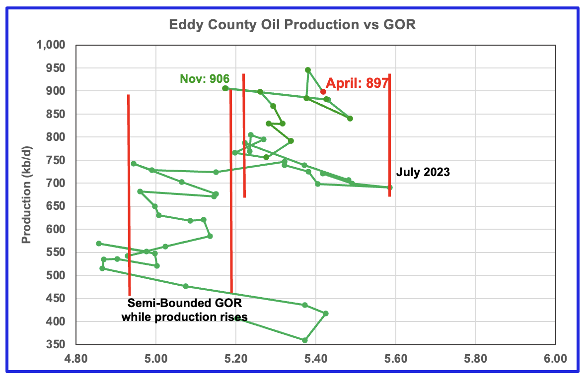 The Eddy county GOR pattern is similar to Lea county except that Eddy broke out from the semi bounded range earlier and for a longer time and then added a second semi bounded GOR phase. For April New Mexico’s Oil Conservation Division (OCD) reported oil production decreased by 48 kb/d to 897 kb/d and stayed within the second semi-bounded region.