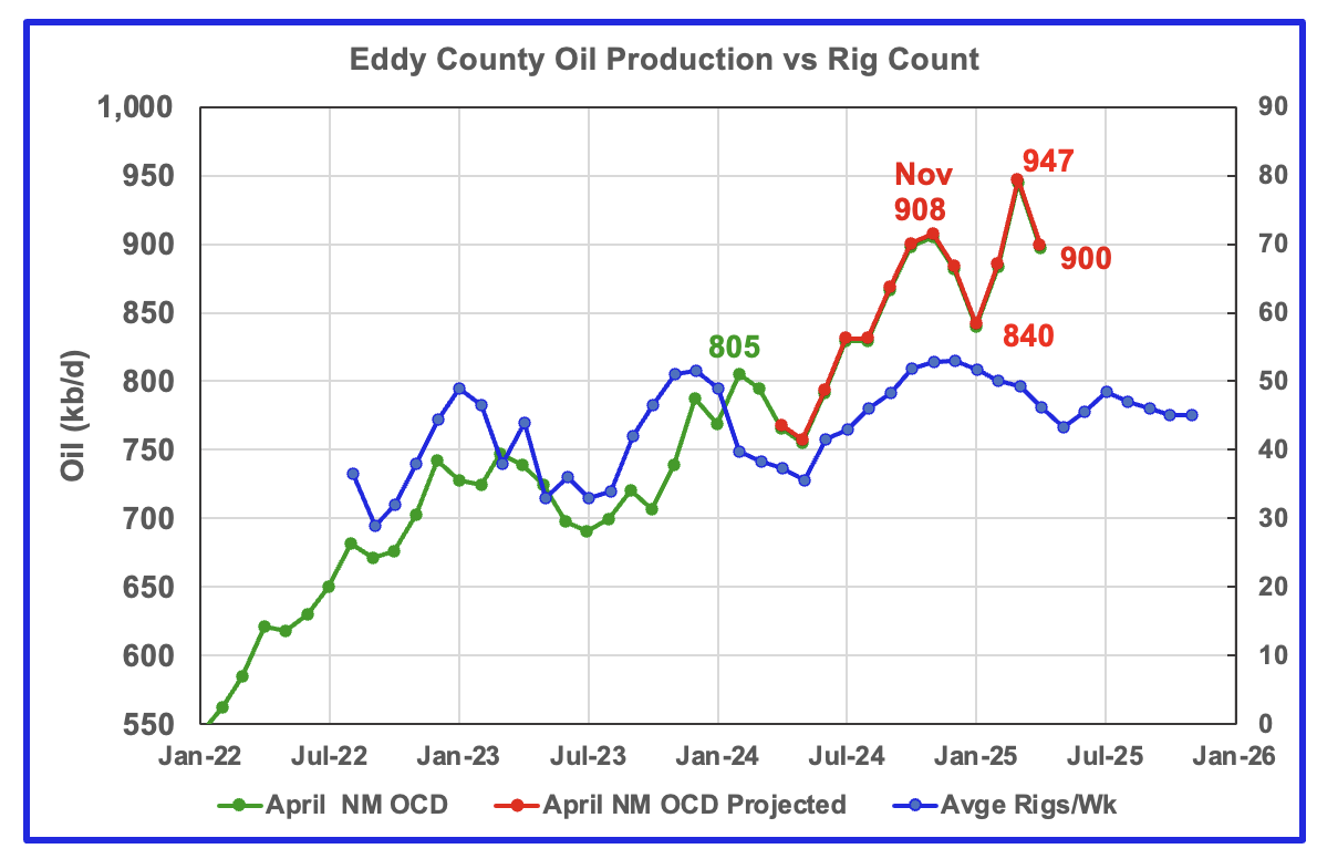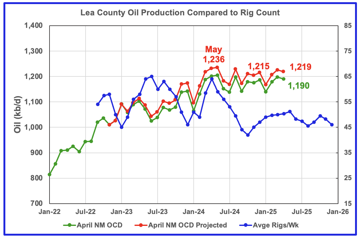 Production has been essentially flat to slightly down since May 2024 as the rig count fell. April’s production fall is still a continuation of the slow declining plateau phase that started in May 2024 and is another indication that Lea County production has peaked or is very close to peaking.