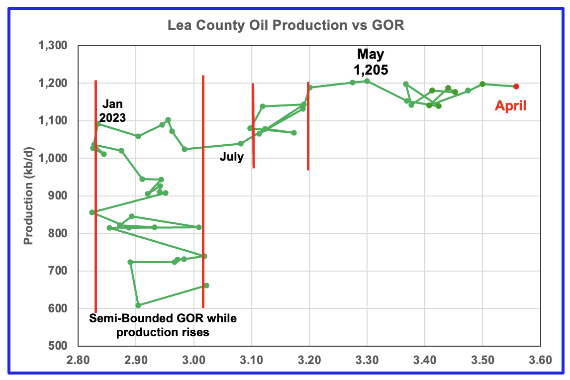 Since July 2023 Lea County’s production continued to increase as the GOR remained within a second semi-bounded region. This may indicate that additional production was coming from a new field/area since the GOR’s behaviour since August 2023 to March 2024 time frame appears once again to be in a semi bounded GOR phase accompanied with rising production.