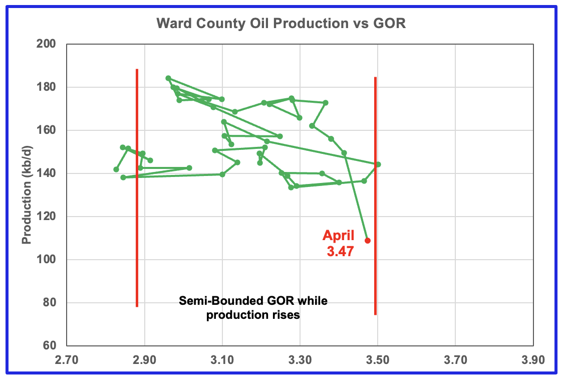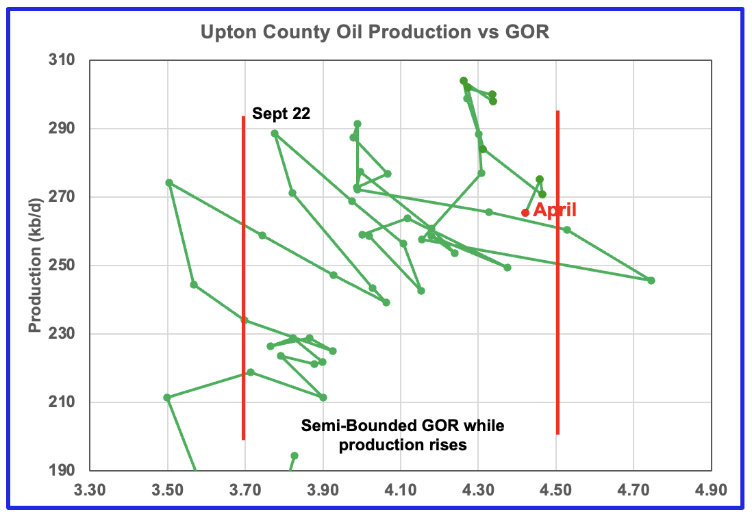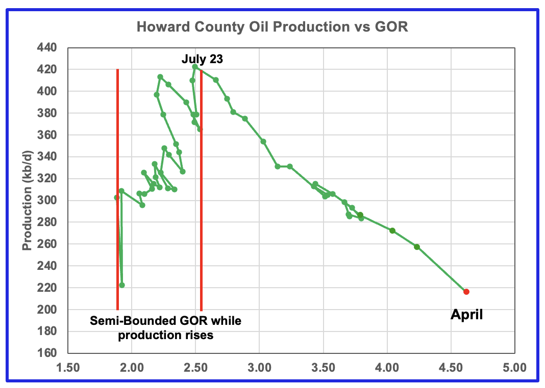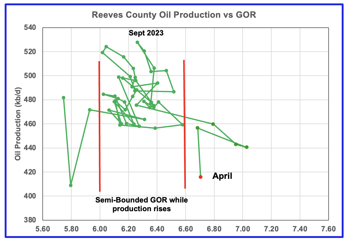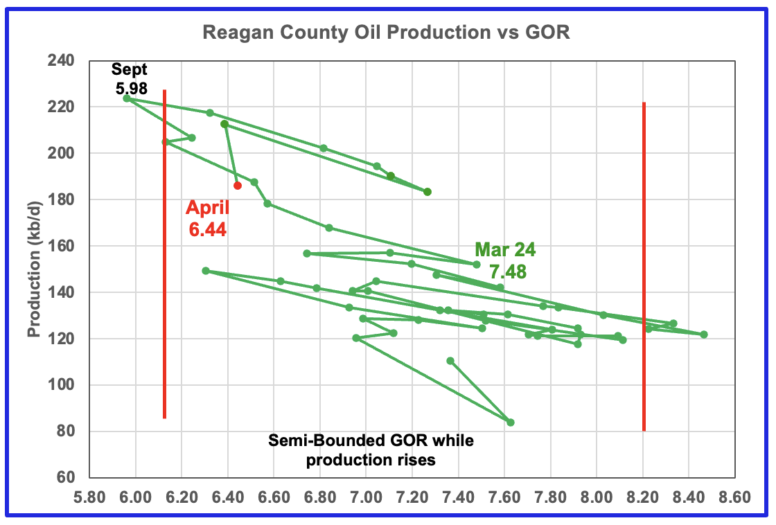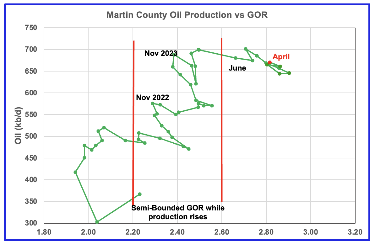 Martin county’s oil production after November 2022 increased and at the same time drifted to slightly higher GORs within the semi bounded range. However the June 2024 GOR saw its first move out of the semi bounded region. The preliminary Texas RRC’s April production for Martin county shows an increase in production of 10 kb/d accompanied by a drop in the GOR to 2.82