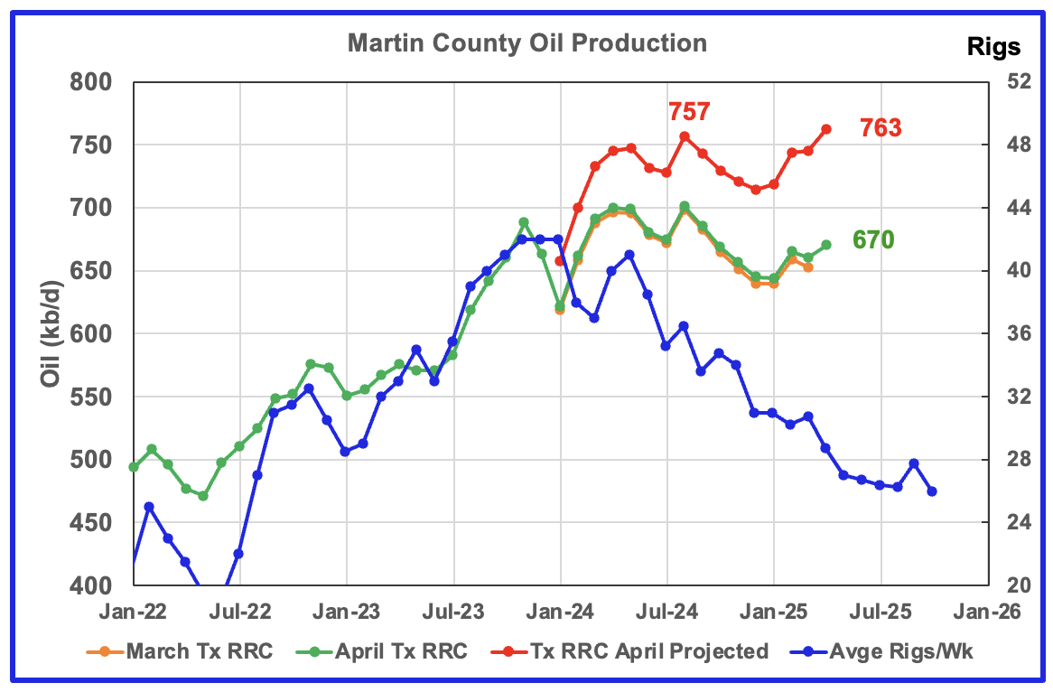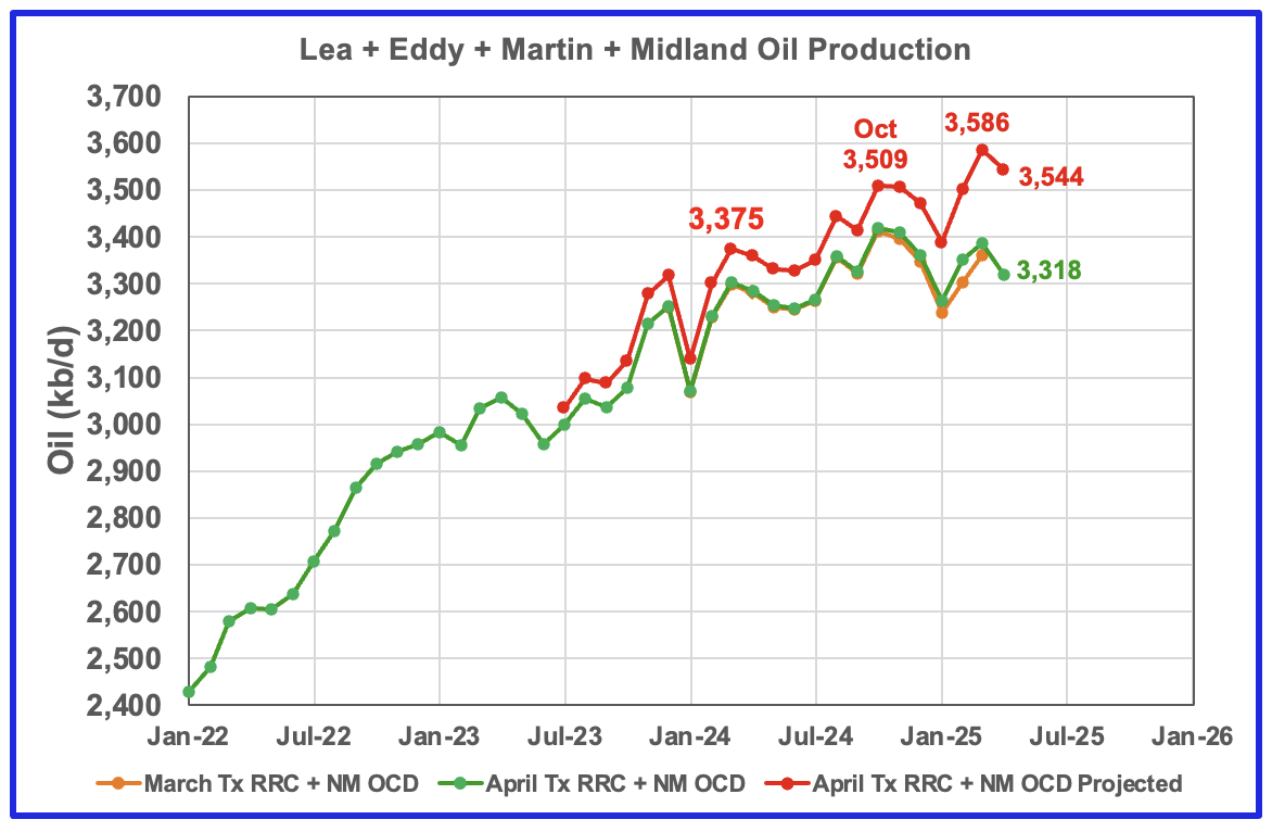 This chart shows the total oil production from the four largest Permian counties. Assuming that current Permian production is close to 6,400 kb/d, these four counties account for 55% of the total. The large April revisions to the previous months for Martin, Midland and Eddy have resulted in a slight increase over October 2024. April’s projected production decreased by 42 kb/d to 3,544 kb/d.