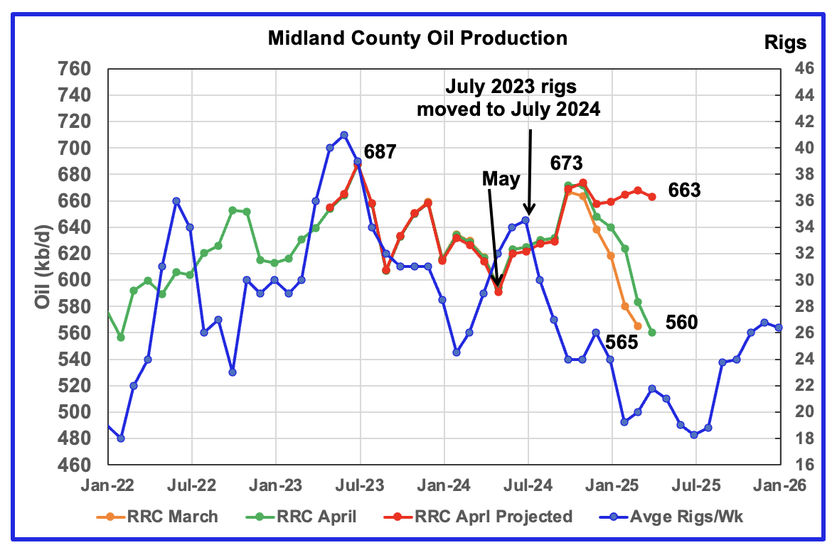 If the twelve month shift in the rig count is approximately correct in that oil production can be tied to the rig count, oil production in Midland county should increase slightly starting in August for about six months before resuming its decline.