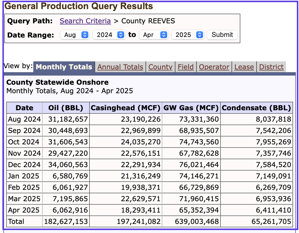 Note the huge increase in the revised December 2024 oil production for Reeves county. The 2025 Reeves data is the more typical monthly production level. This increase also affects the overall Texas and District 8 production. The Texas production projection is a combination of the 2025 data and a correction to the 2025 Texas production. The Texas RRC has been made aware of this anomaly.