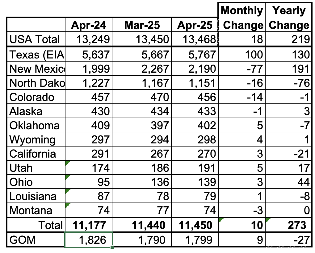 April’s production in the Big Two states increased by a combined 23 kb/d to 7,957 kb/d, a new high, and is 13 kb/d higher than October 2024. Clearly these two states were the drivers of US oil production growth up to October 2024. Will the rising trend slow in the next few months?