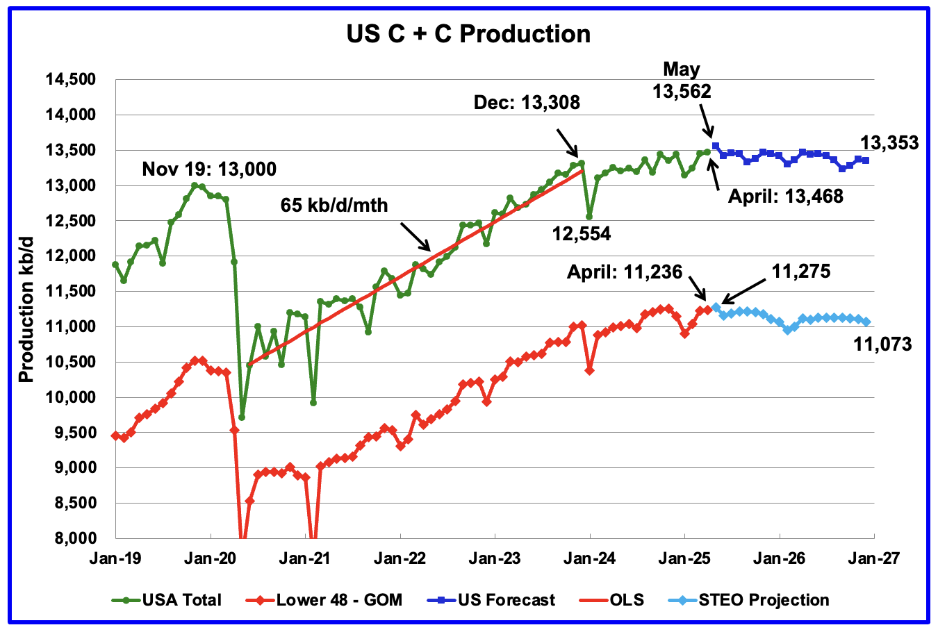 The dark blue graph, taken from the June 2025 STEO, is the U.S. oil production forecast from May 2025 to December 2026. Output for December 2026 is expected to reach 13,353 kb/d, revised down by 86 kb/d from last month. From April 2025 to December 2026 U.S. production is expected to drop by 115 kb/d kb/d.