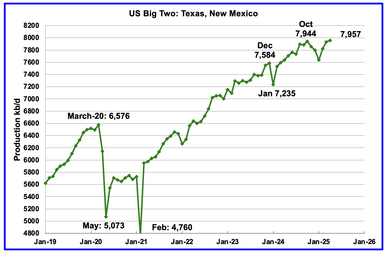 Combined oil output for the Big Two states Texas and New Mexico.