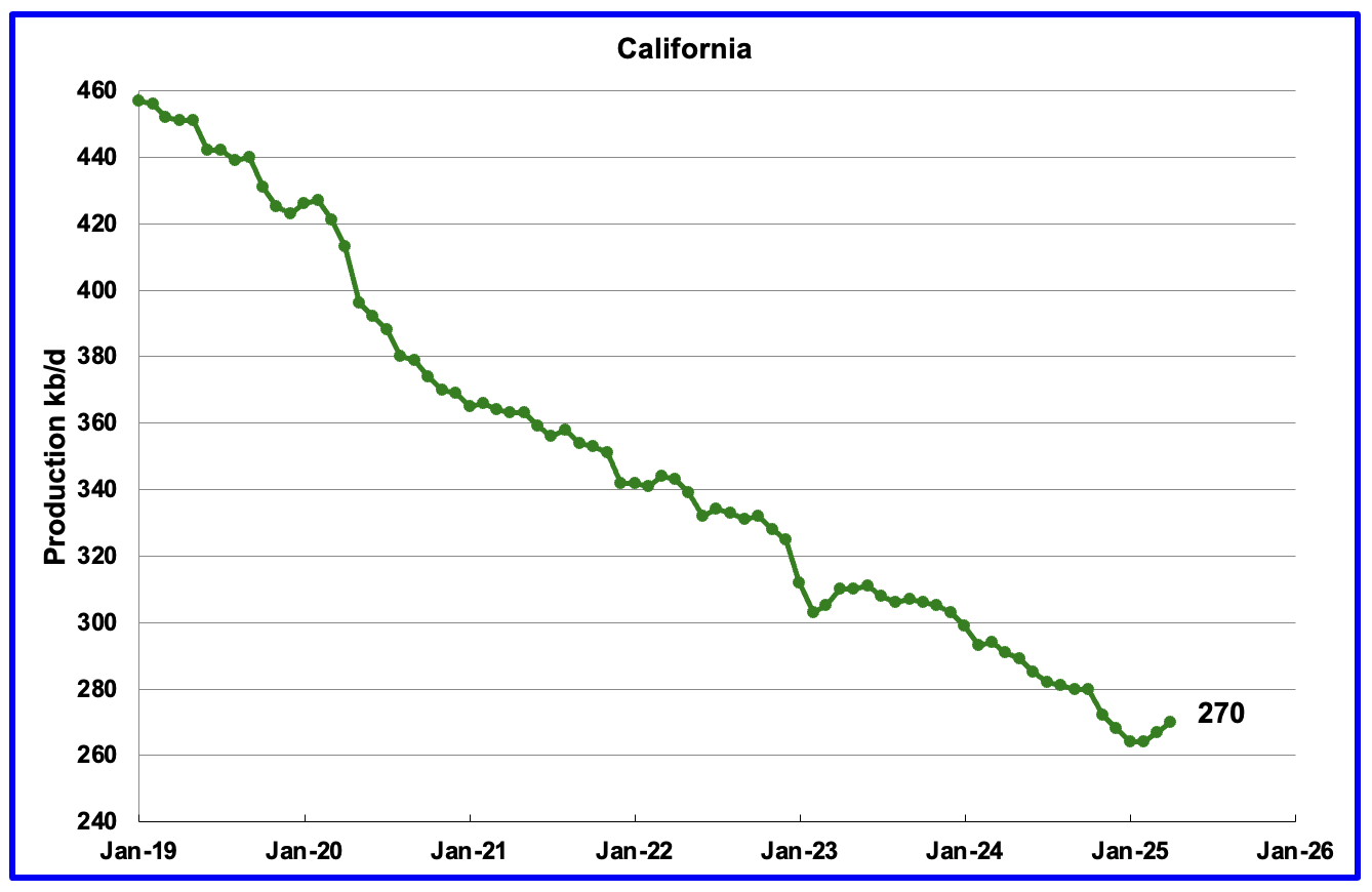 California’s overall declining production trend continues but April saw a small increase to 270 kb/d.