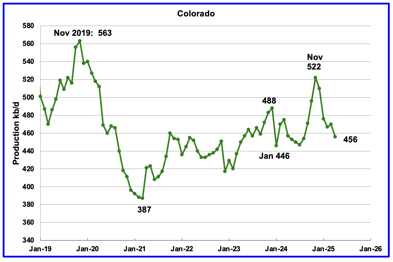 Coloradoʼs April oil production dropped by 14 kb/d to 456 kb/d.