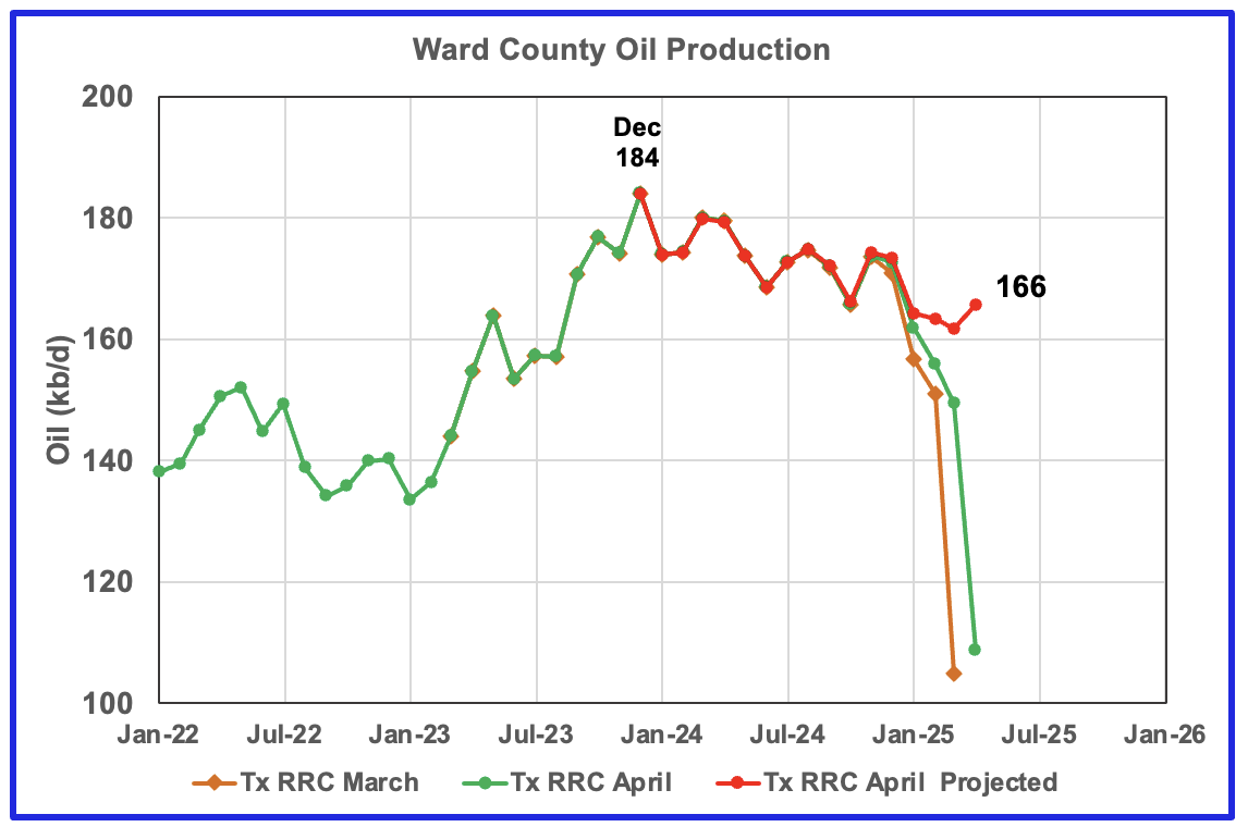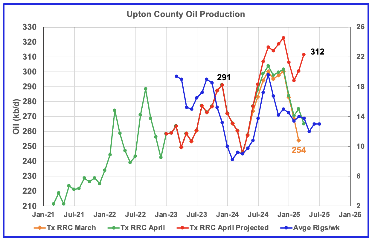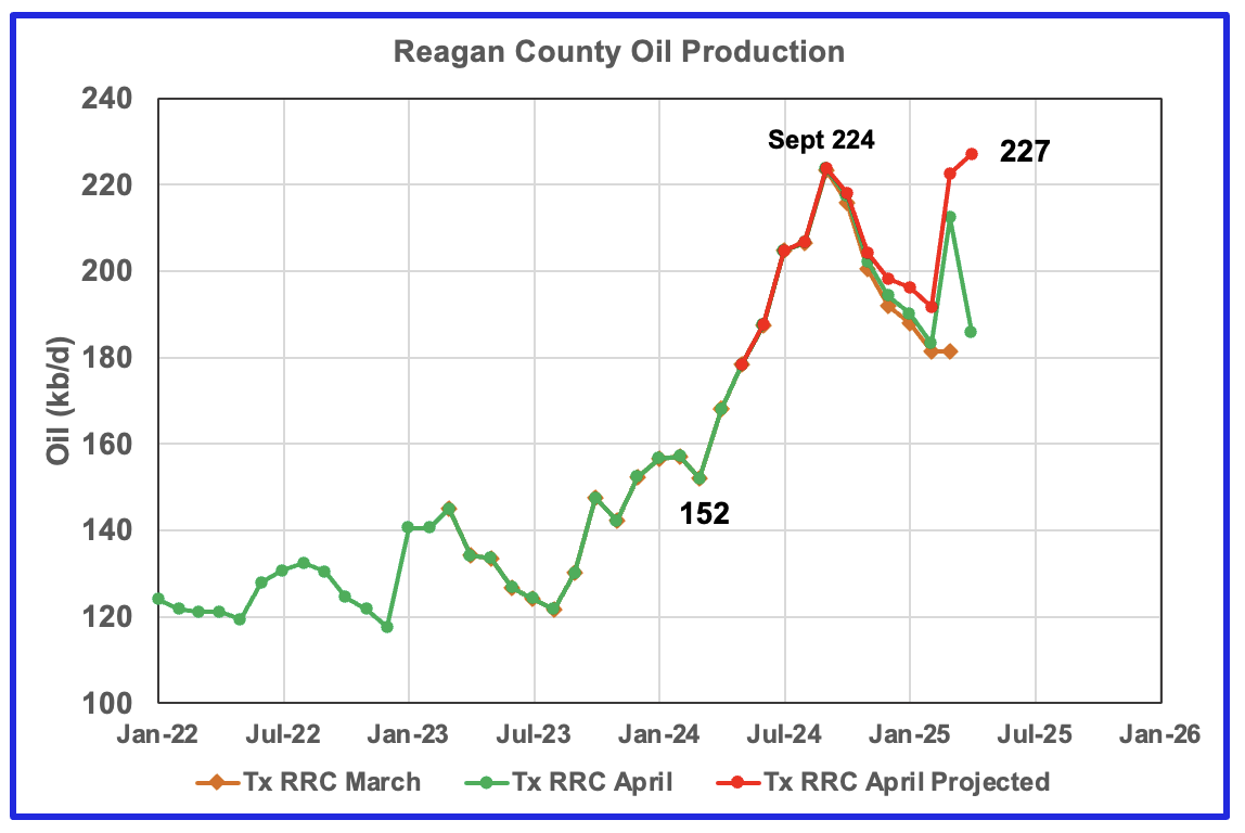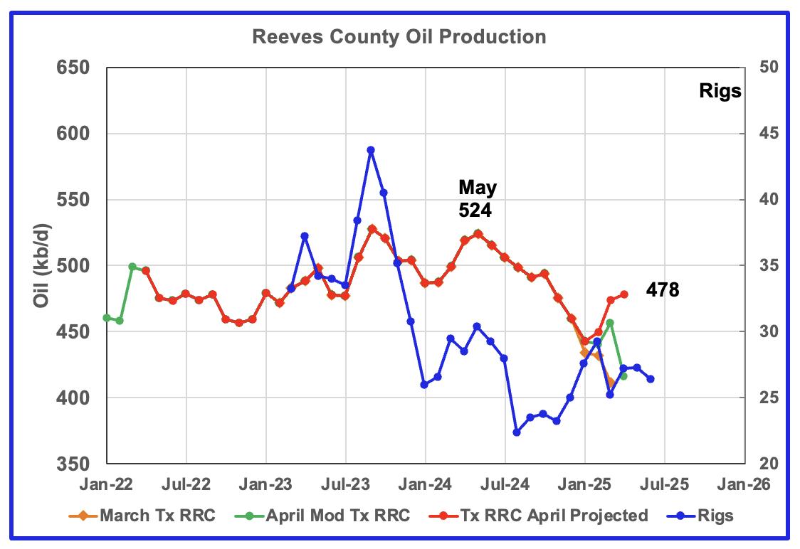 The red graph is a projection for oil production as it would look after being updated over many months. This projection is based on a methodology that uses preliminary March and April production data. The green graph shows oil production reported by the Texas RRC for April and is 10 kb/d higher than March’s. Note how production has dropped from September 2024 to January 2025, green graph. The March projected increase could be the beginning of a short term plateau before production begins to fall again.