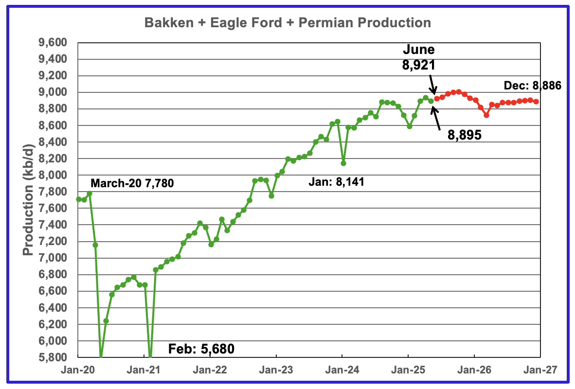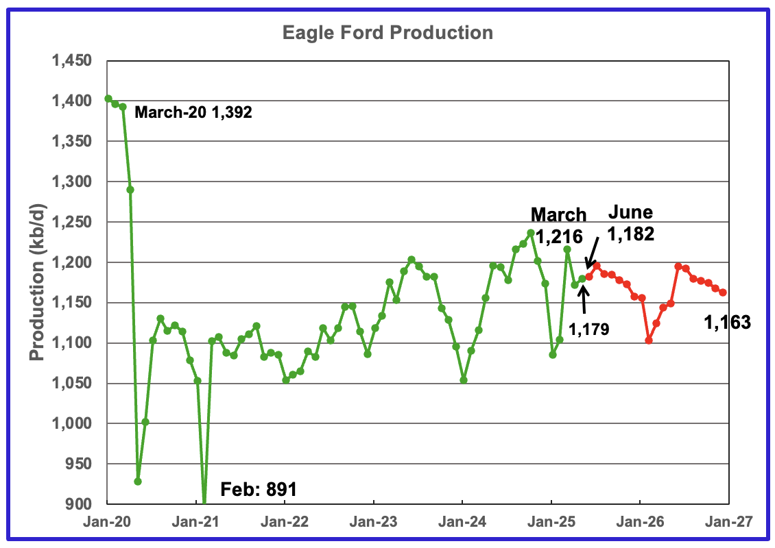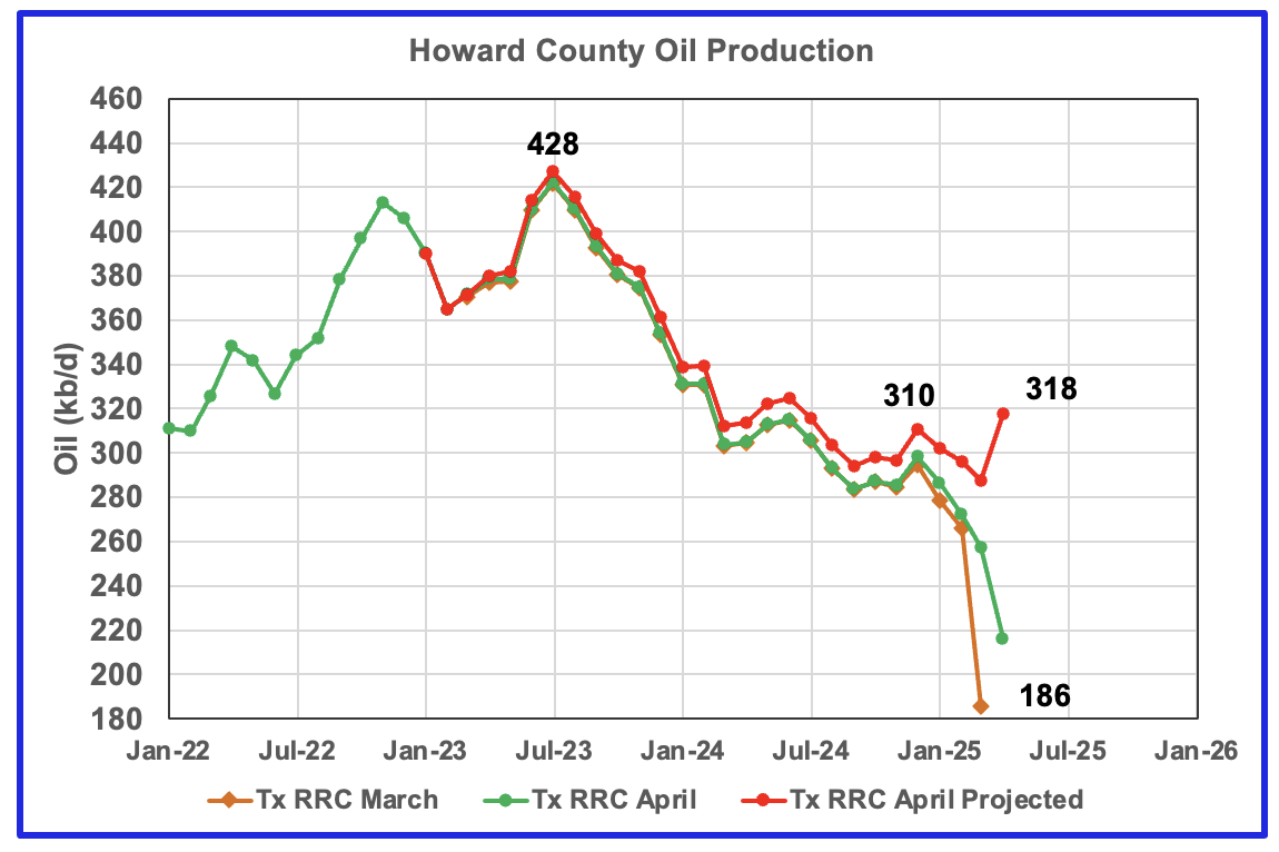 The red graph is a projection for oil production as it would look after being updated over many months. This projection is based on a methodology that uses preliminary March and April production data. The green graph shows oil production reported by the Texas RRC for April and is 10 kb/d higher than March’s. Note how production has dropped from September 2024 to January 2025, green graph. The March projected increase could be the beginning of a short term plateau before production begins to fall again.