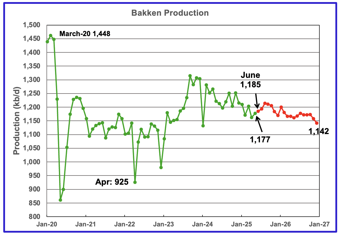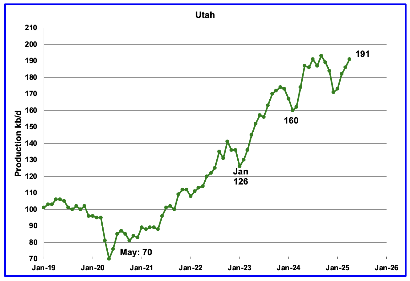April’s production increased by 5 kb/d to 191 kb/d. Utah had 8 rigs operating from October 2025 through May 2025 but dropped to 7 in June.
