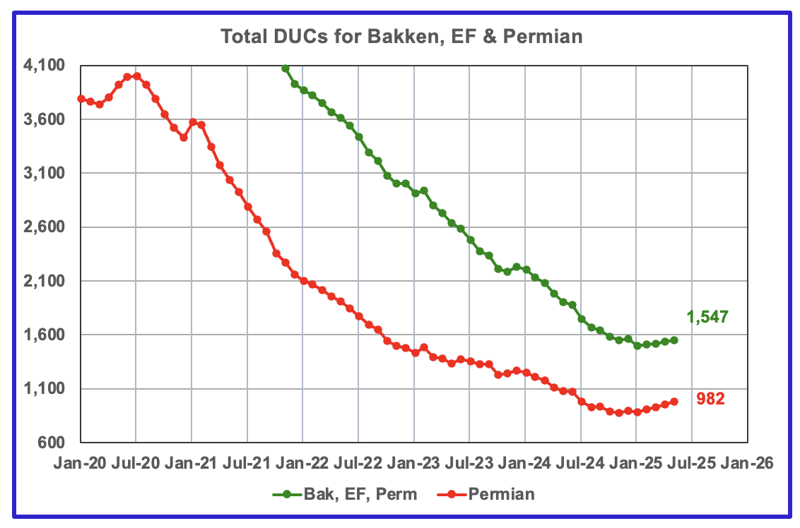 The blue graph shows the average number of weekly rigs operating during a given month as taken from the weekly drilling chart. The rig graph has been shifted forward by twelve months to better align with production. So the average 34.5 Rigs/wk operating in July 2023 have been moved forward to July 2024 to show the possible correlation and time delay between rig count, completions and oil production. This shift is much larger than the typical six to eight months used in other counties. Not clear why there should be such a difference.