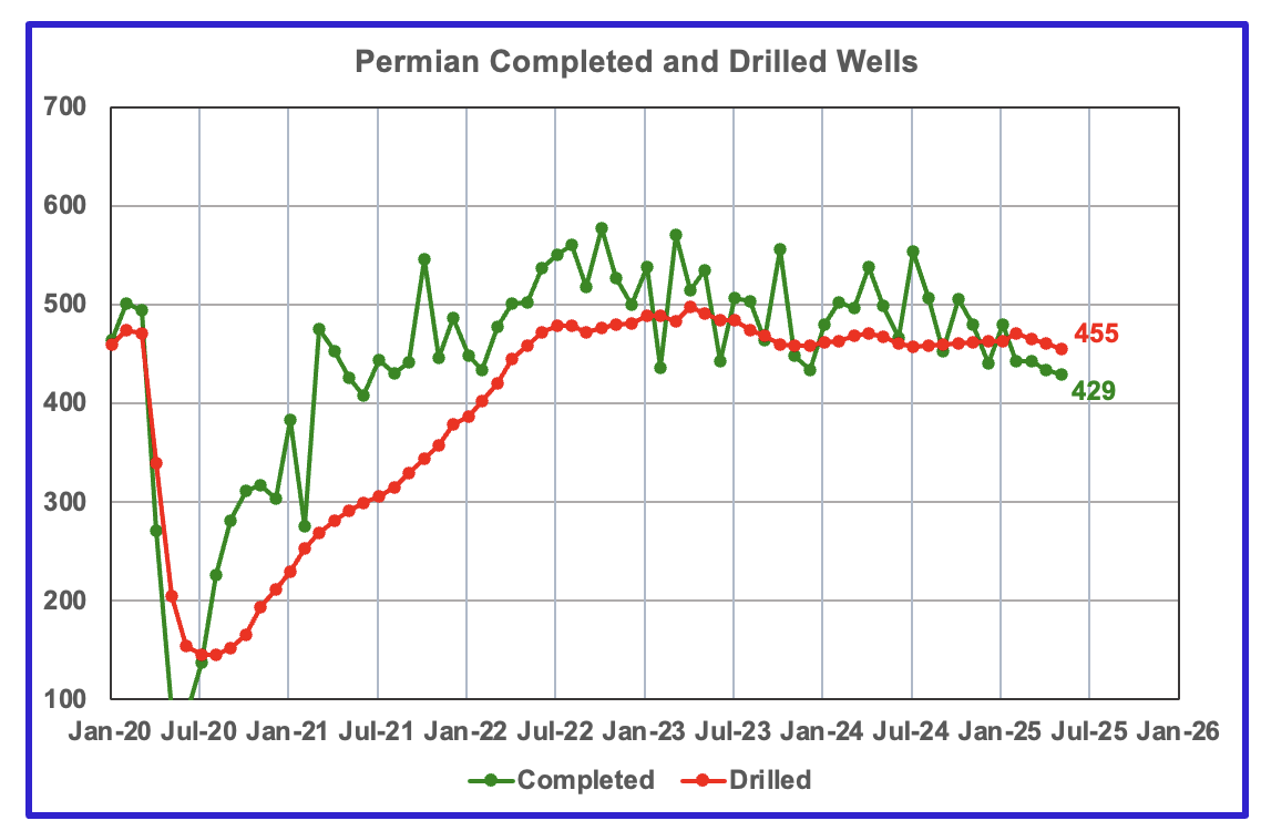 Texas production dropped from October to January. The drop could be related to the drop in completions that started in October while the January drop was a combination of cold weather and low completions. However production in February, March and April has rebounded but is still 65 kb/d lower than October 2024.