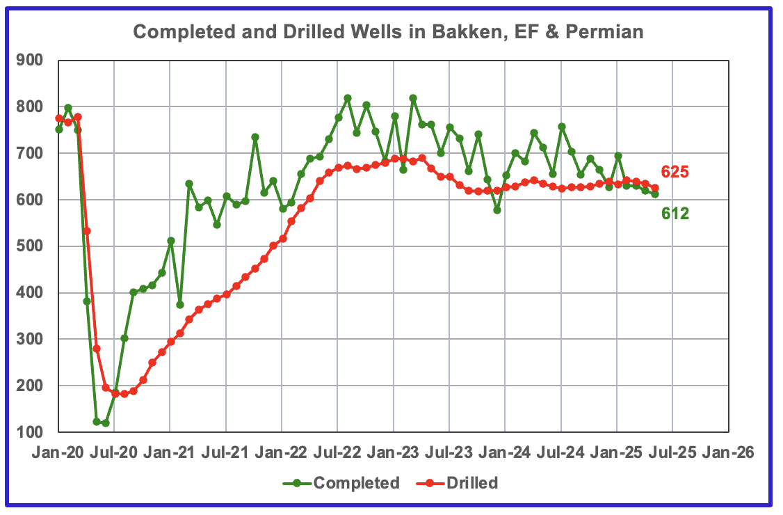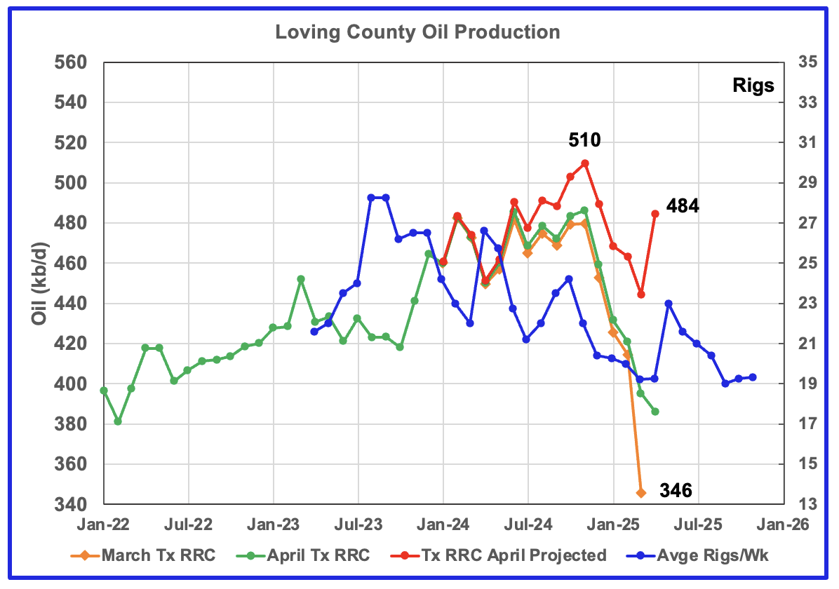 Clearly the production rise up to November 2024 is closely associated with the rise in the rig count and associated well completions delayed by roughly seven months. The rising production starting in February 2025 does not correlate with the dropping rig count. However that rising trend reversed for April as the projected production fell by 47 kb/d.