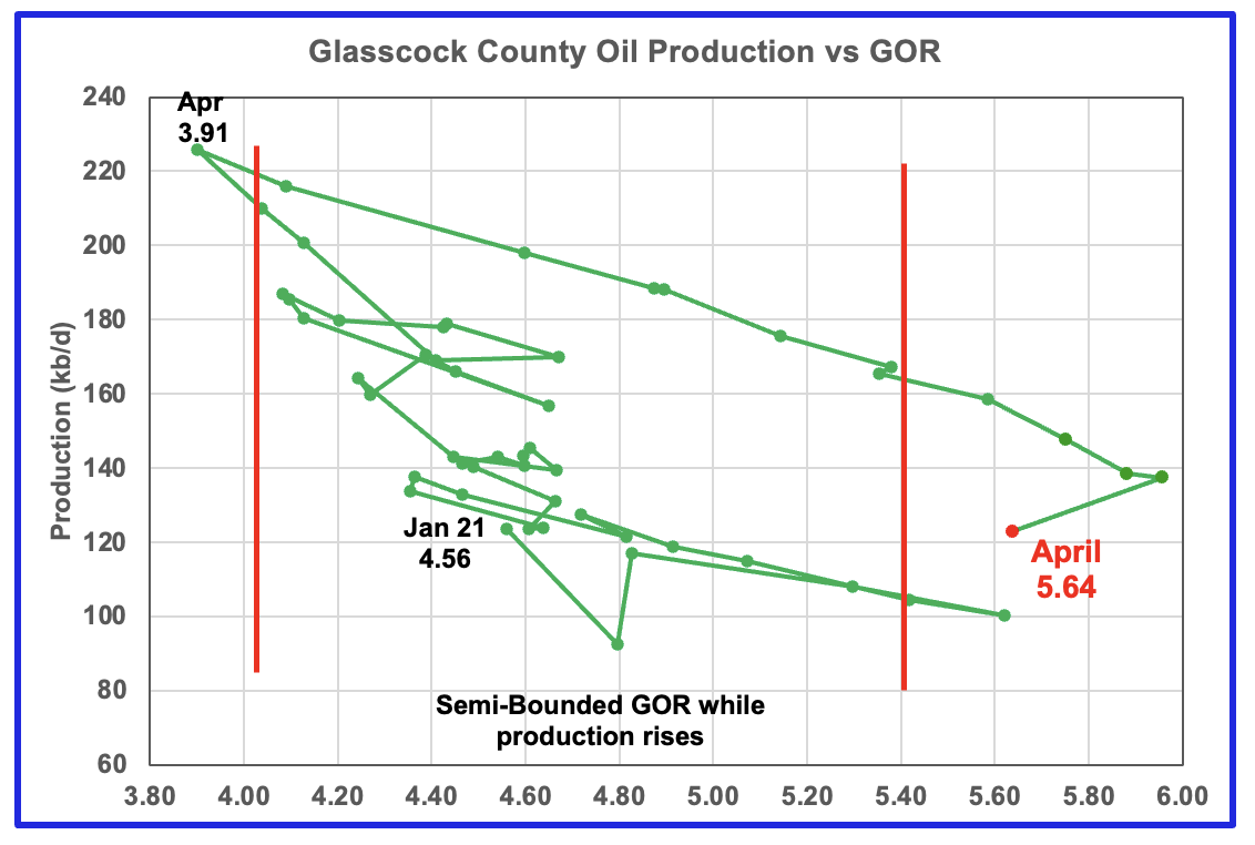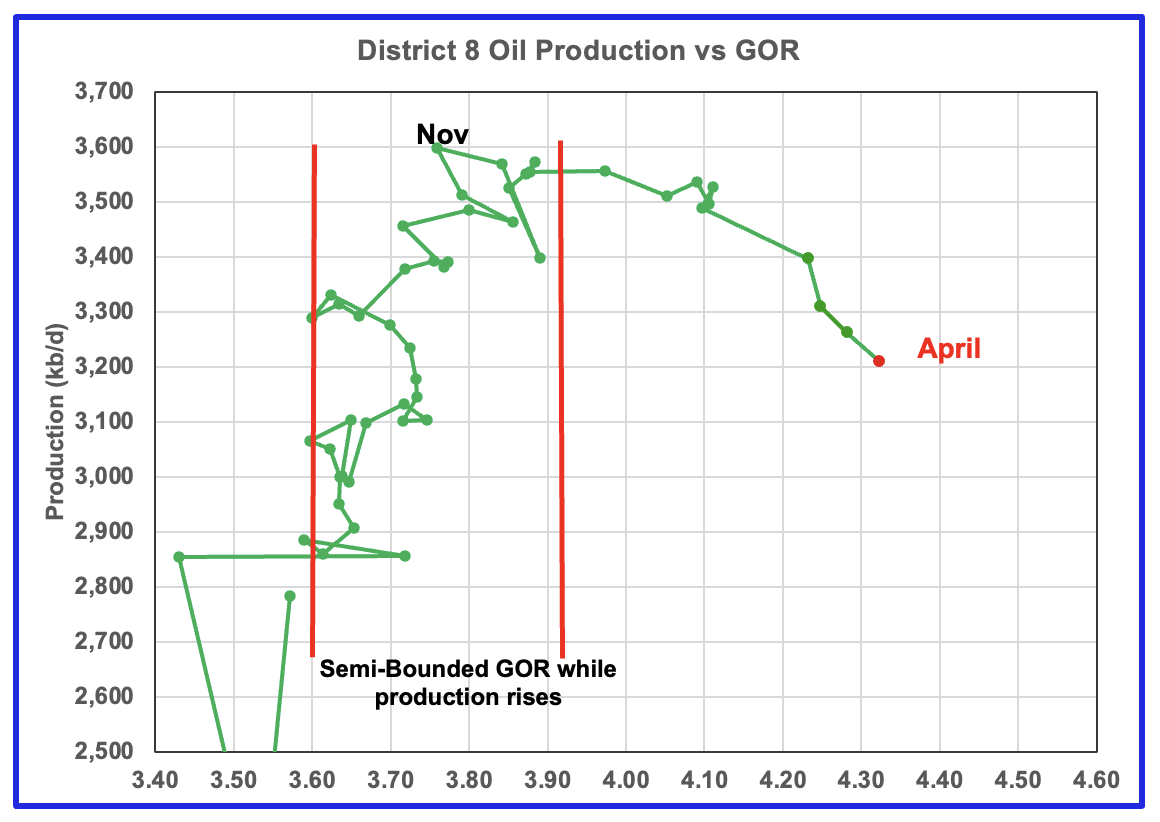 Plotting an oil production vs GOR graph for a district may be a bit of a stretch. Regardless here it is and it seems to indicate many District 8 counties may well be into the bubble point phase. The GOR continued to increase in April to 4.32. This is another indicator that implies District 8 may be on a production plateau.
