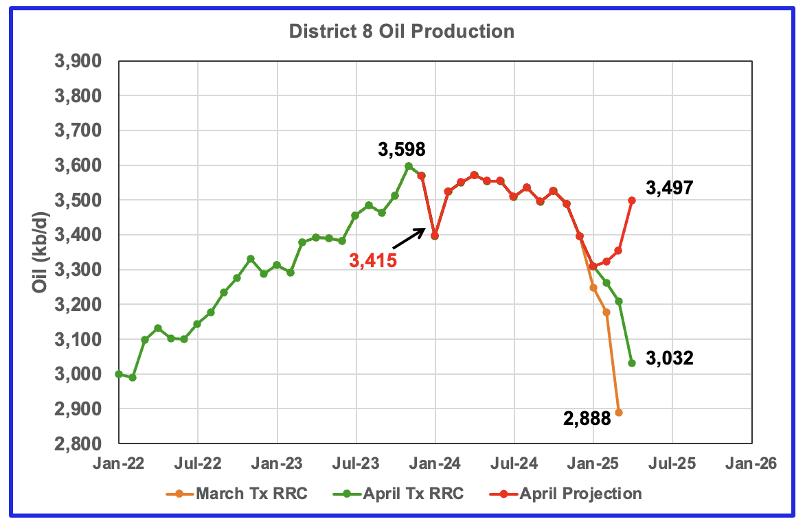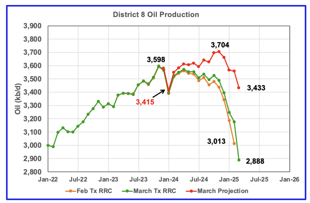 In the previous chart, District 8’s oil projected production peaked in November 2024 at 3,704 kb/d. March’s projected production dropped by 125 kb/d to 3,433 kb/d and is 271 kb/d lower than November 2024.