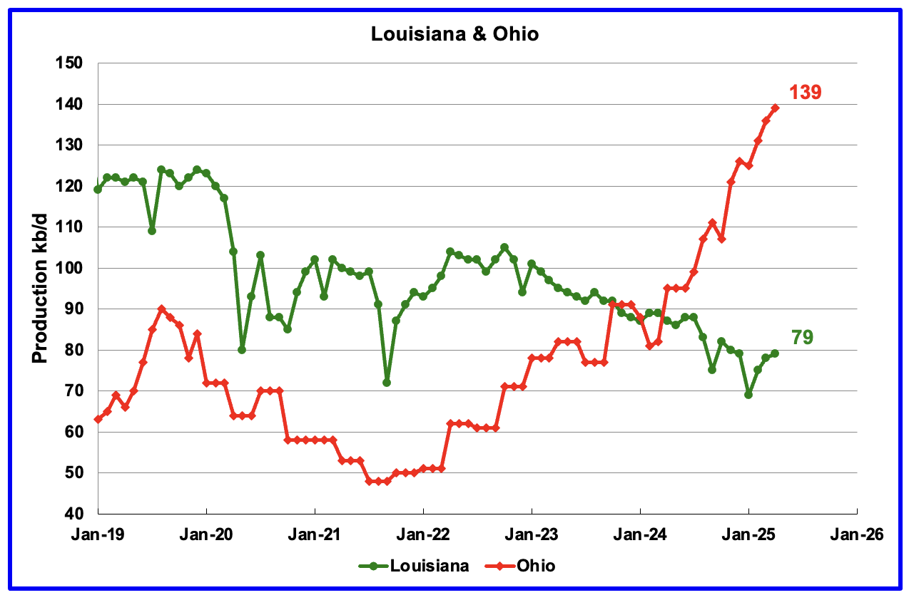 Ohio has been added to the Louisiana chart because Ohio’s production has been slowly increasing since October 2021 and passed Louisiana in November 2023.