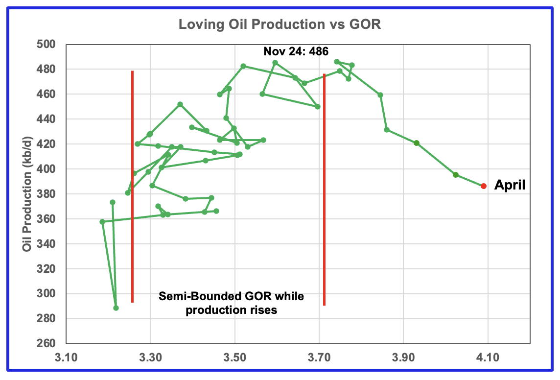 The GOR moved out of the second semi-bounded GOR region in April 2024 and production hit a new high of 1,205 kb/d in May 2024. Since July 2024 the GOR has been range bound between 3.35 and 3.45 but April saw the GOR increase to a new high of 3.56 while the production dropped slightly.
