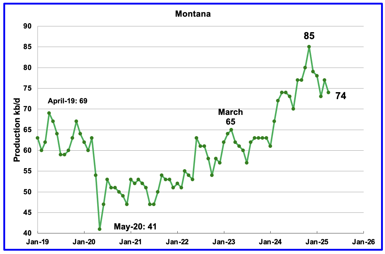 April’s oil production dropped by 3 kb/d to 74 kb/d. Montana had one oil rig operating from December 2024 through May 2025. Two rigs were operating at the end of June.
