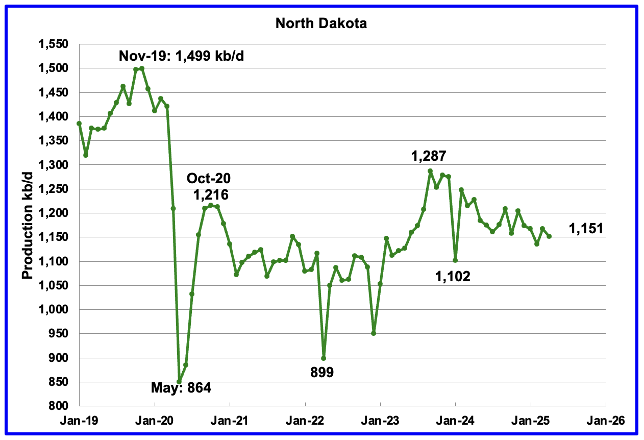 April’s output dropped by 16 kb/d to 1,151 kb/d. Production is down by 136 kb/d from the post pandemic peak of 1,287 kb/d. The North Dakota Department of Mineral resources reported April production dropped by 21 kb/d to 1,172 kb/d, which is 21 kb/d higher than the EIA’s.