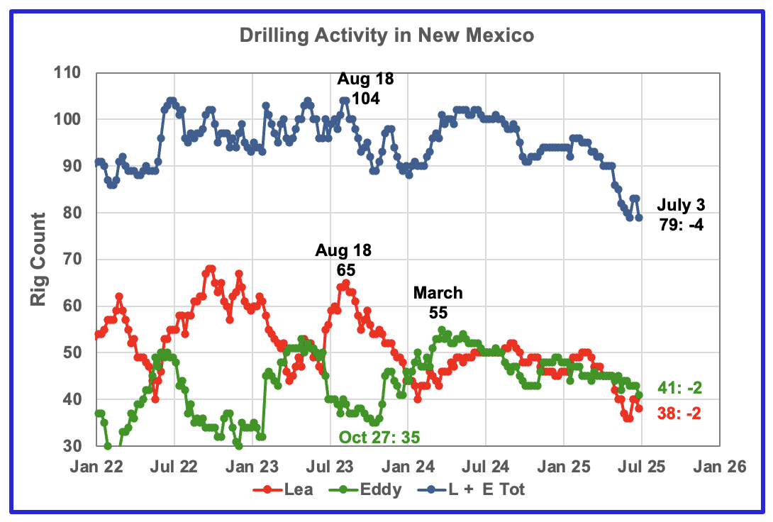 The total rig count in Lea and Eddy counties in the week ending July 3 was 79 down 15 from the January 2025 count of 94. The total rig count began to drop May and accelerated in June.