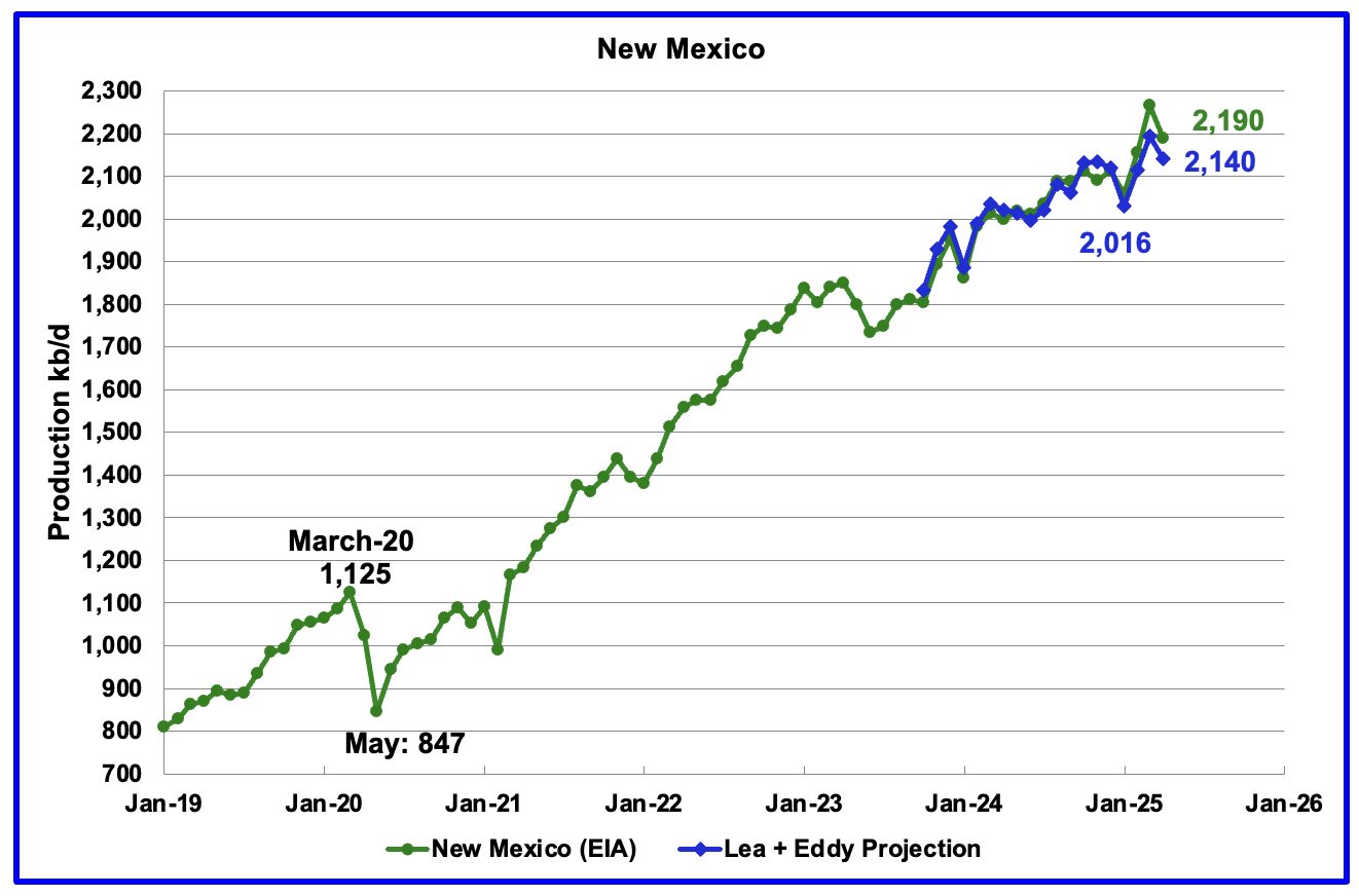 According to the EIA, New Mexico’s April production dropped by 77 kb/d to 2,190 kb/d.