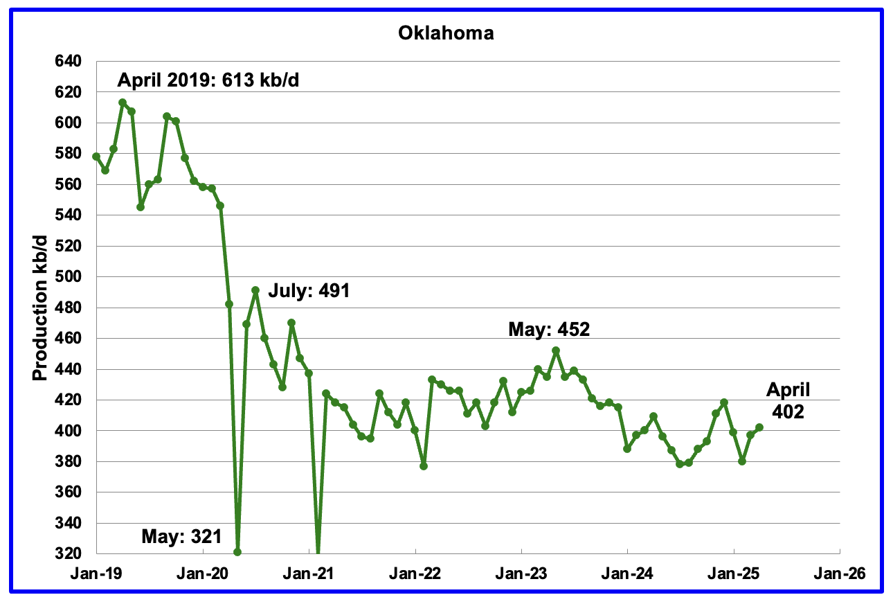 Oklahoma’s output in April rose by 5 kb/d to 402 kb/d. Production remains below the post pandemic July 2020 high of 491 kb/d and is down by 50 kb/d since May 2023. Output entered a slow declining phase in June 2023 and now appears to be range bound around 400 kb/d