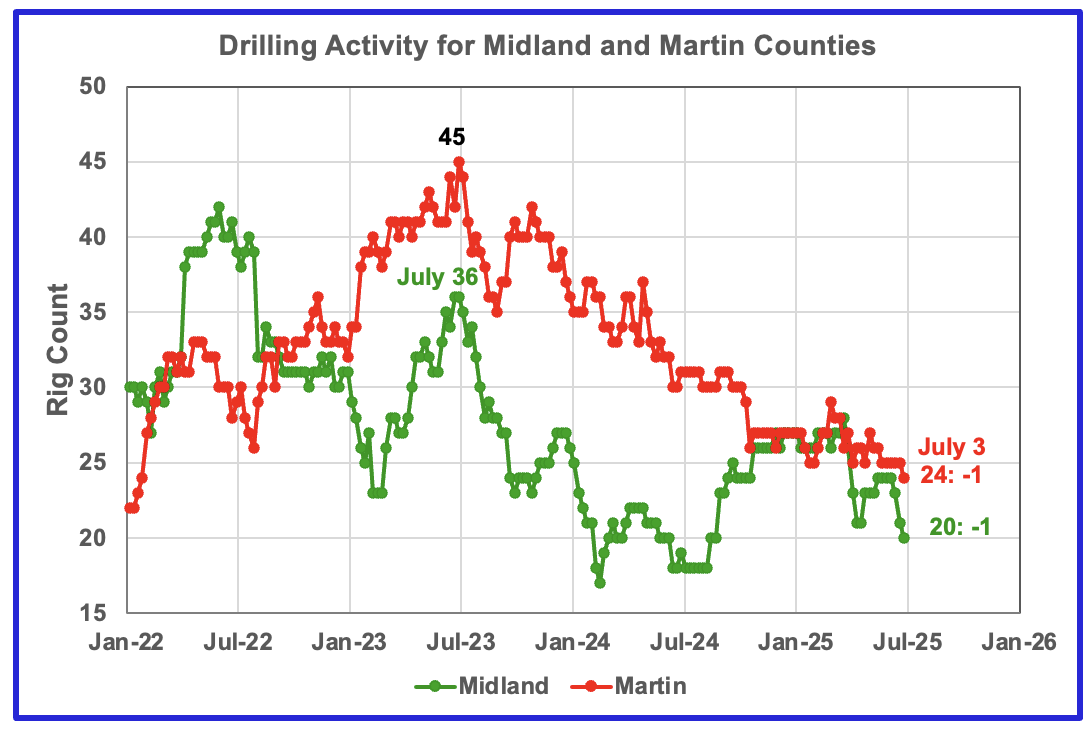 The Midland county rig count dropped to 20 rigs in the first week of July.
