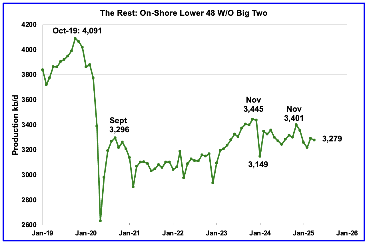 The light blue graph is the STEO’s projection for output to December 2026 for the Onshore L48. April’s Onshore L48 production rose by 10 kb/d to 11,236 kb/d. From April 2025 to December 2026 production is expected to decrease by 163 kb/d to 11,073 kb/d. December 2026 production was revised down by 121 kb/d from last month. Note how production starts declining after May 2025 to December 2026.