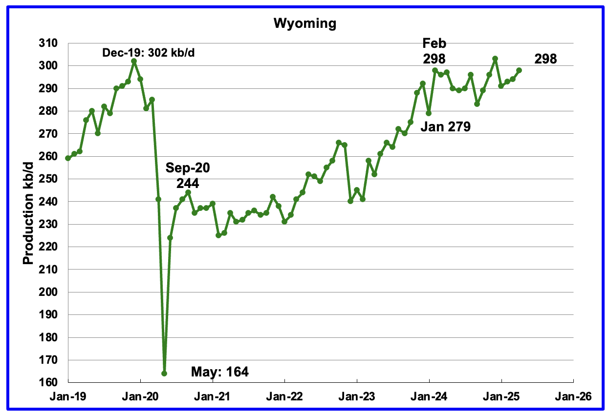 Wyoming’s oil production has been rebounding since March 2023. However the rebound was impacted by the January 2024 storm. Production reached a post pandemic high in February 2024 and appears to have entered a plateau phase. April’s production rose by 4 kb/d to 298 kb/d.