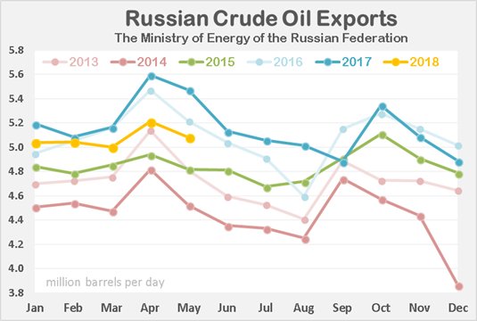 This data is from the Russian Minister of Energy and is through May, 2018. Russian production has been almost flat for the last three months. Data from the Russian Minister of Energy averages about 400,000 barrels per day higher than the EIA’s estimate.