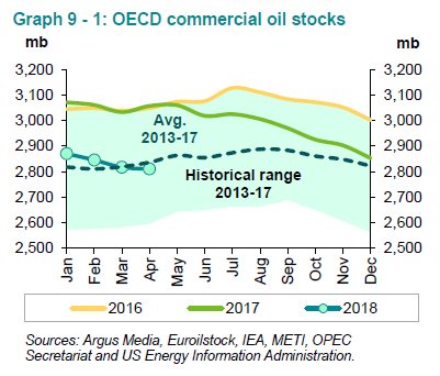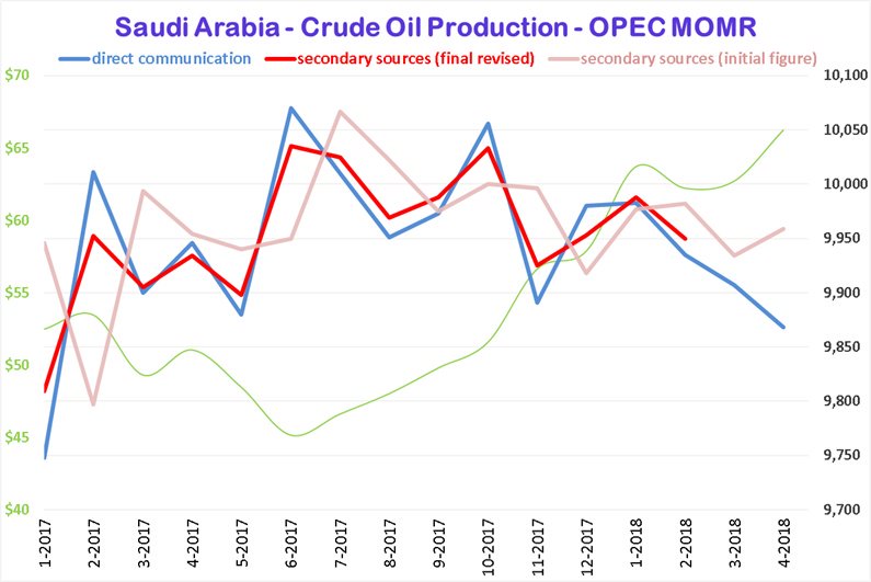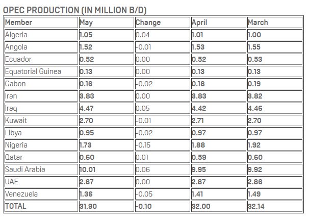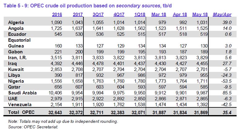 2018-06-12 OPEC, citing secondary sources, says its May oil output rose 35 kb/day m/m to 31.87 million b/day (Aprils initial figure was 31.93 million b/day)