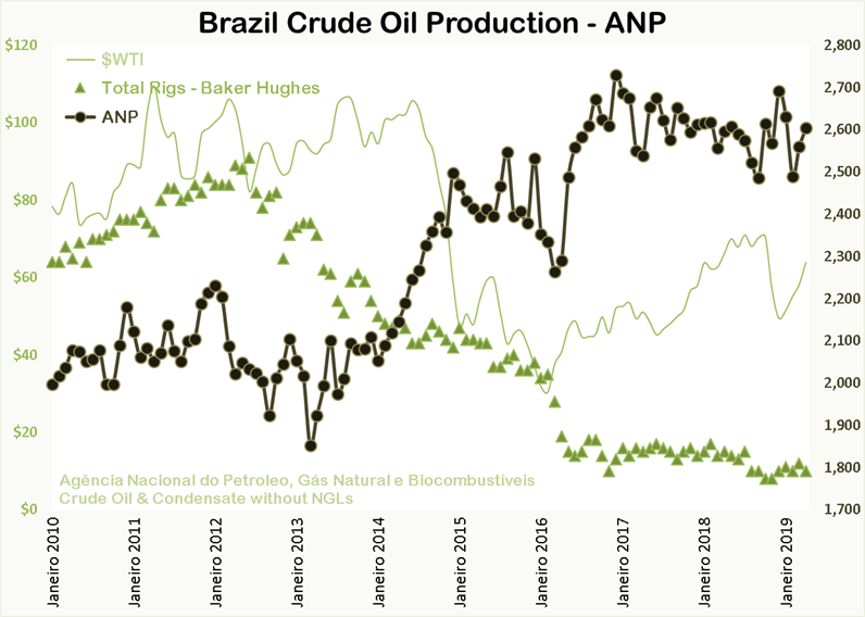 The above chart is through March 2019. US production was up 241,000 barrels per day to 11,905,000 bpd. That was after February production was revised down by 19,000 bpd. Production is still below November and December however.